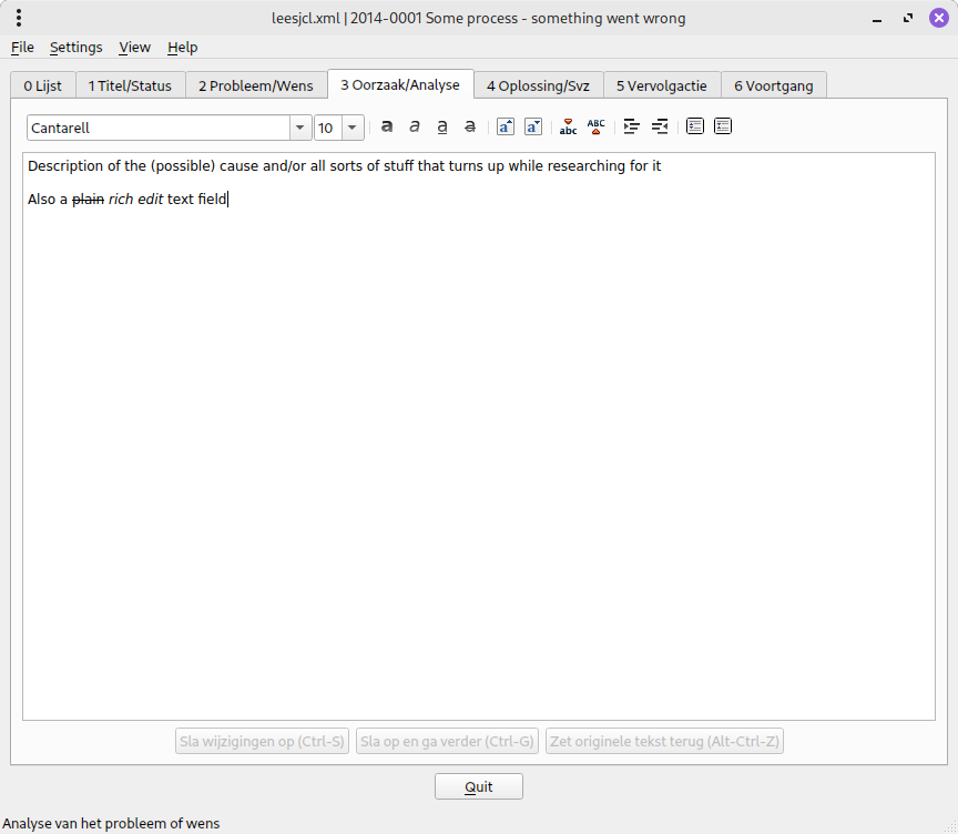 Once you start making changes to the page, the buttons become usable so you can either save your changes, save and move on to the next page, or revert the changes. In the original wxPython version it was possible to check for one of these to be done before leaving a tab and if necessary prevent the leaving; PyQt didn't have that possibility so in that version the tabs at the top become deactivated so you can't move off the page by clicking on them and to remind you you need to confirm or cancel the changes: