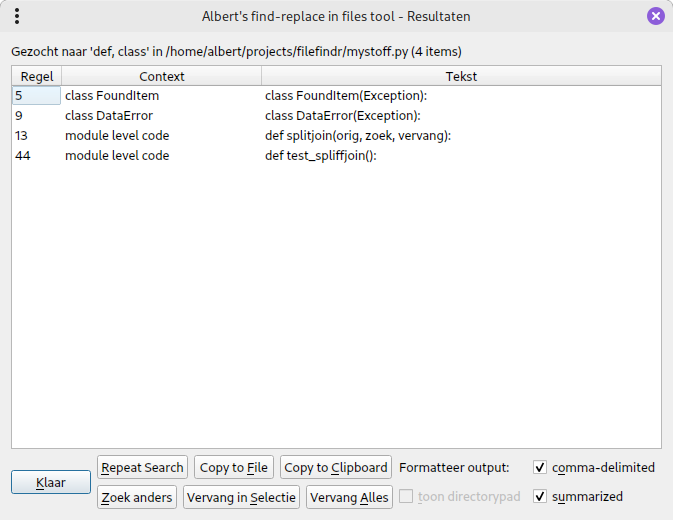 Je kunt hiermee bepalen dat je alleen wilt zoeken in bestanden met bepaalde extensies en of je wat meer informatie wilt laten zien over waar in het bestand een zoekresultaat voorkomt. Ik heb dit momenteel alleen gerealiseerd voor Python sources en wat je ermee kunt zien is in welke functie en/of class de zoekresultaten voorkomen