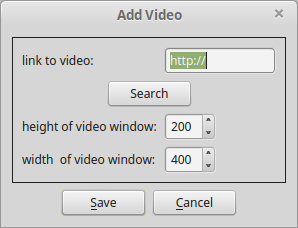 De menu opties Add stylesheet, Add link, Add image, Add video and Add audio zijn bedoeld om het makkelijker te aken om respectievelijk een stylesheet, hyperlink, plaatje, filmpje or audio fragment toe te voegen via een dialoog om meteen bepaalde benodigde of nuttige attributen toe te kunnen voegen:
